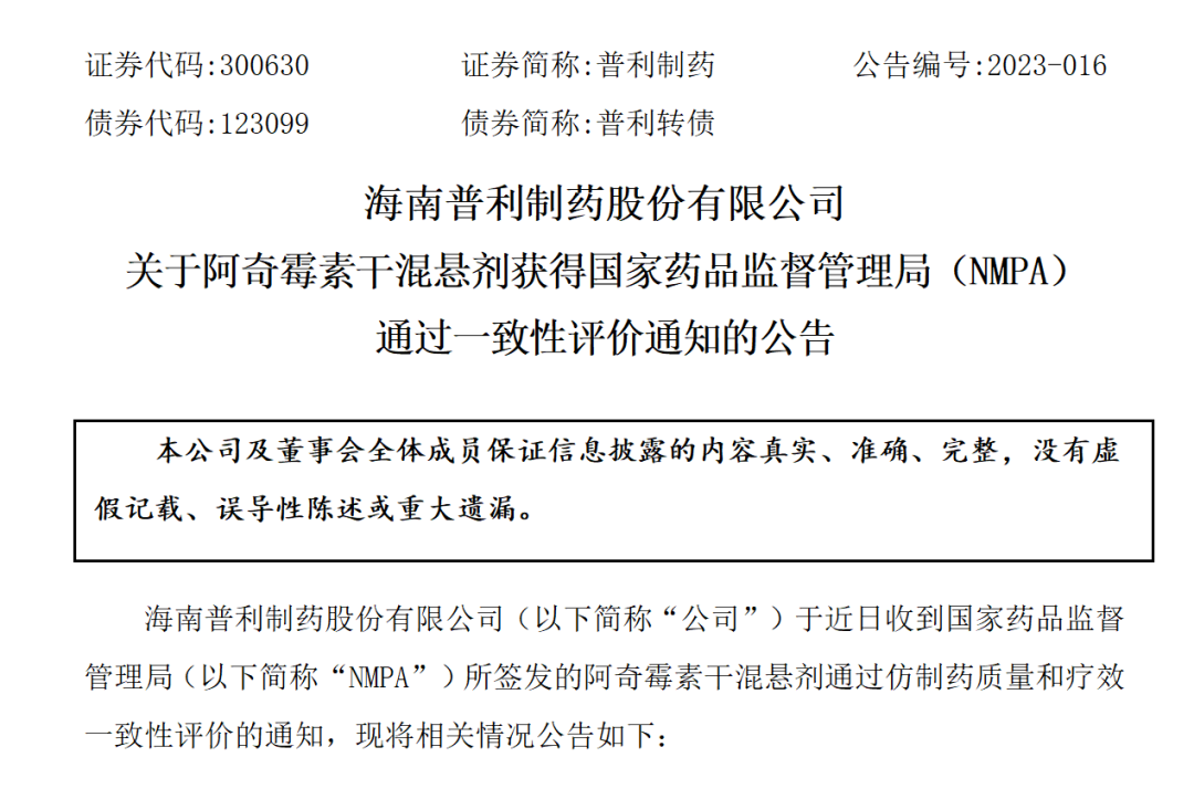 近期,普利制药生产的普利舒奇阿奇霉素干混悬剂,共计3个规格,通过国家药监局审批,仿制药质量和疗效一致性评价批准上市。