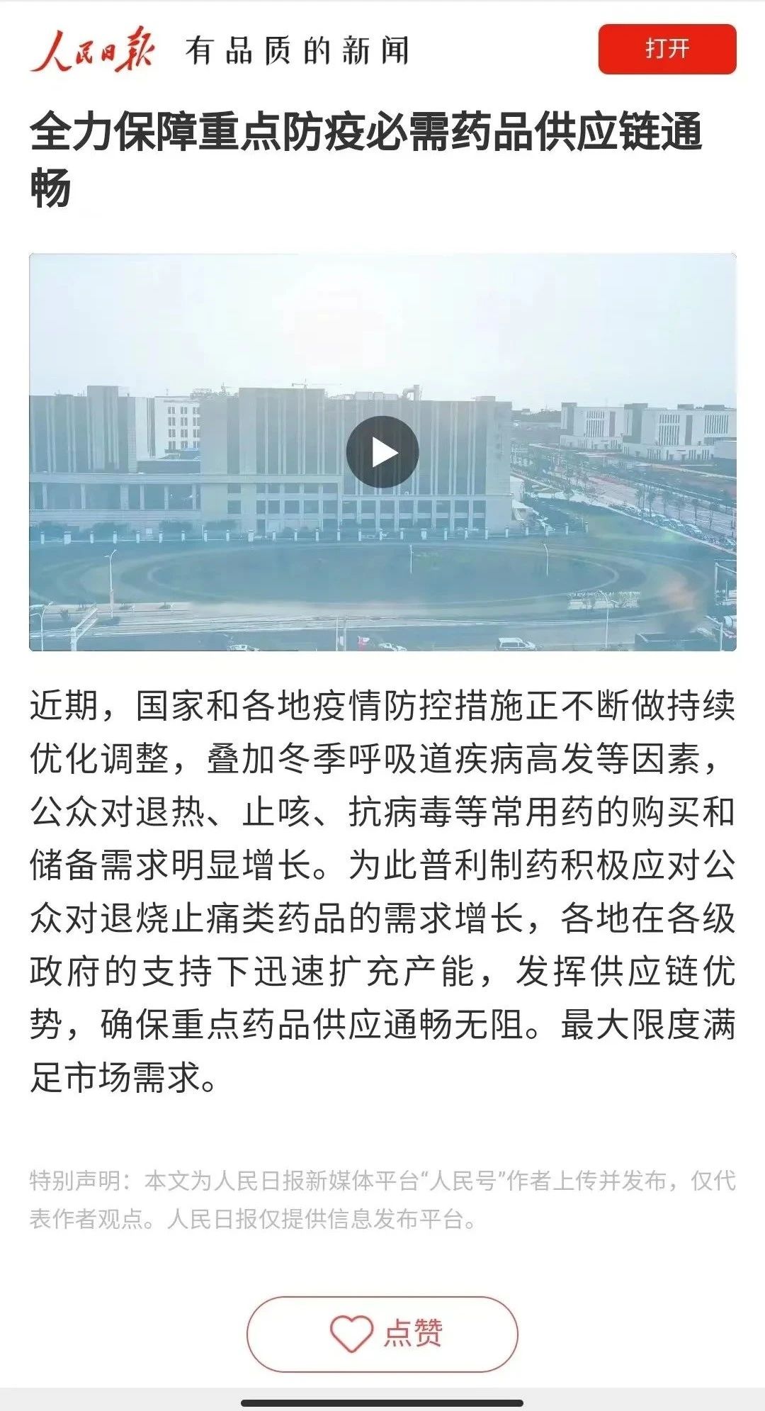 近期,国家和各地疫情防控措施正不断做持续优化调整,叠加冬季呼吸道疾病高发等因素,公众对退热、止咳、抗病毒等常用药的购买和储备需求明显增长。面对防疫新形势,普利制药积极应对公众对退烧止痛类药品的需求增长,开足马力加快生产,千方百计做好原料保障、在浙江与海南各级政府的支持下迅速扩充产能、物流运输协调等配套服务,发挥企业供应链优势,确保重点药品供应通畅无阻。