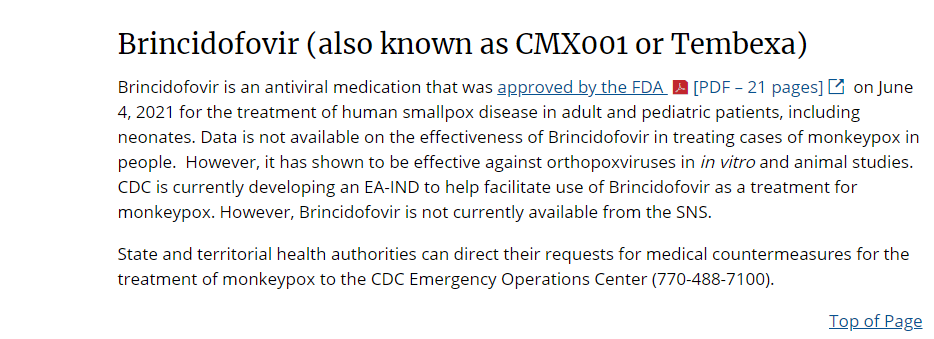 目前,美国疾病控制与预防中心(CDC)正在制定一份扩展使用在研新药方案(EA-IND),以推动布林西多福韦用于猴痘患者的治疗。