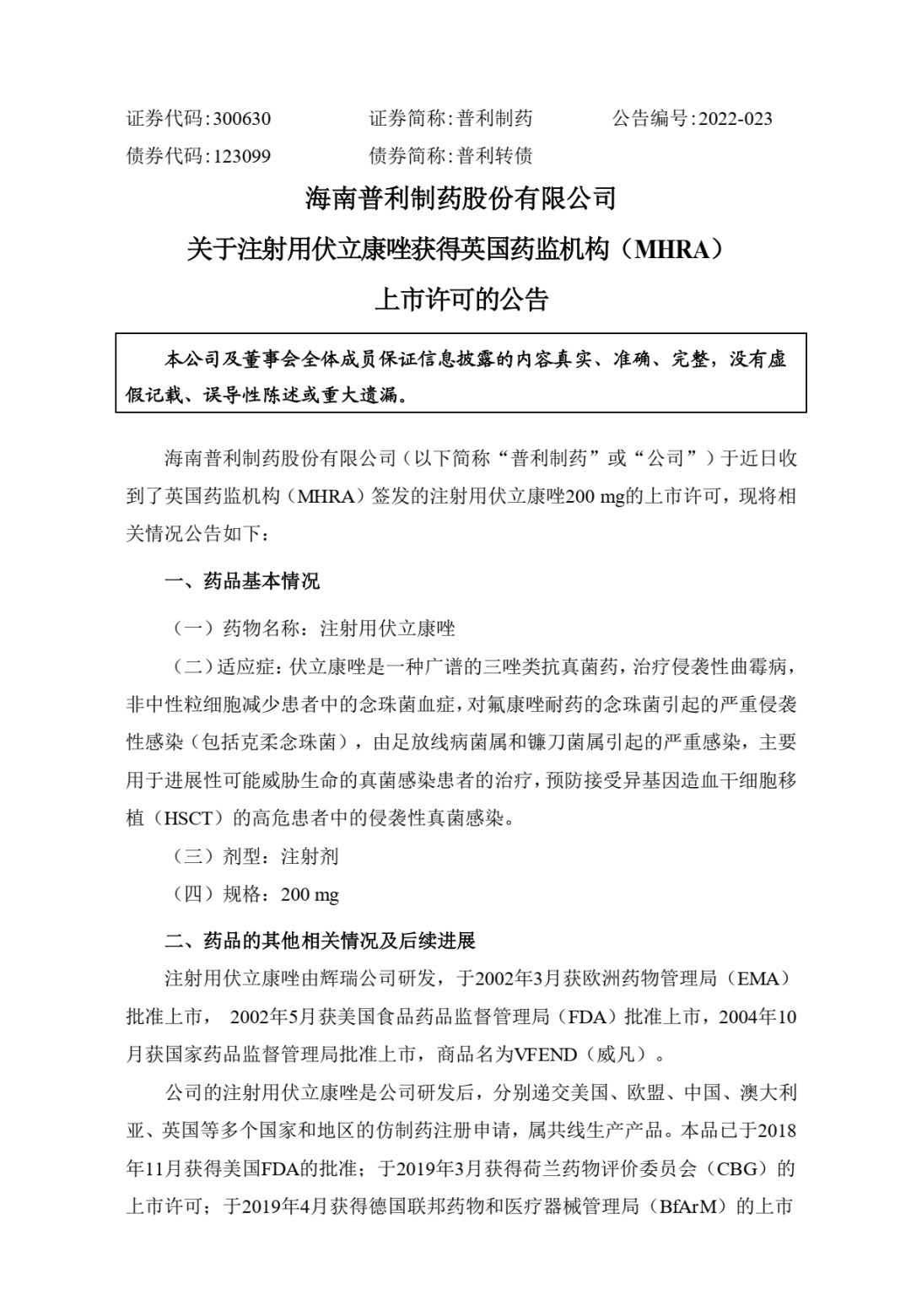 1.注射用伏立康唑获得英国药监机构(MHRA)上市许可;