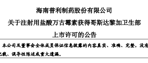 5.注射用盐酸万古霉素获得哥斯达黎加卫生部上市许可。